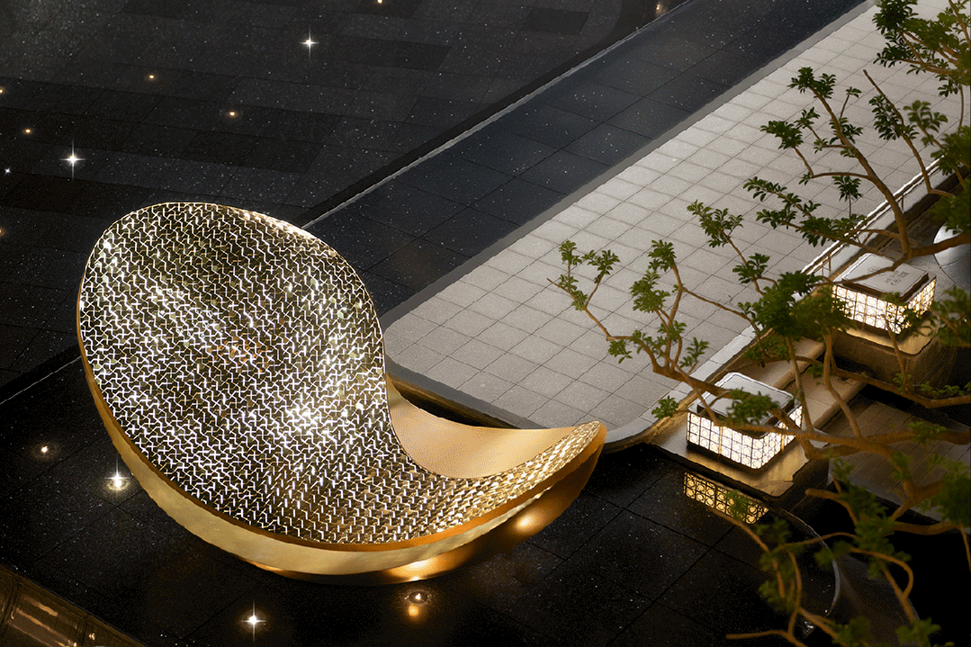 透过中空挂落,日光倾泻而入下方的“金石浮光”的艺术雕塑,阳光取金石肌理交错出细腻的纹理,低调奢华的空气劈面而来。