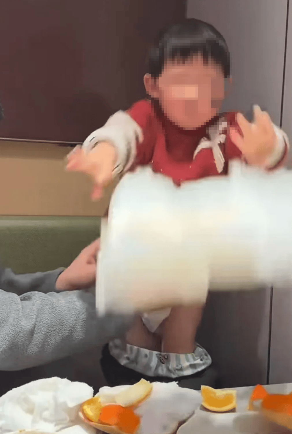 视频画面可谓离谱:某海底捞门店里,一位父亲正给孩子正在餐桌上换纸尿裤,没等办事员上前劝阻,熊孩子小手一扬,用过的纸尿裤间接飞进了咕嘟冒泡的暖锅里。
