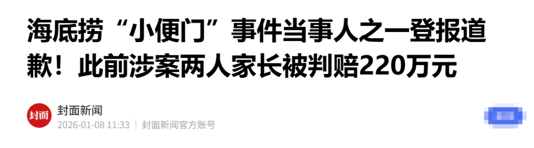 就正在“尿布门”发酵的前两天,《报》登载了《孩子餐厅“撒泼”,家长被判赔220万!》的报道,两名未成年人及家长正式报歉,并向海底捞赔付220万元。两边均未上诉,判决已生效。